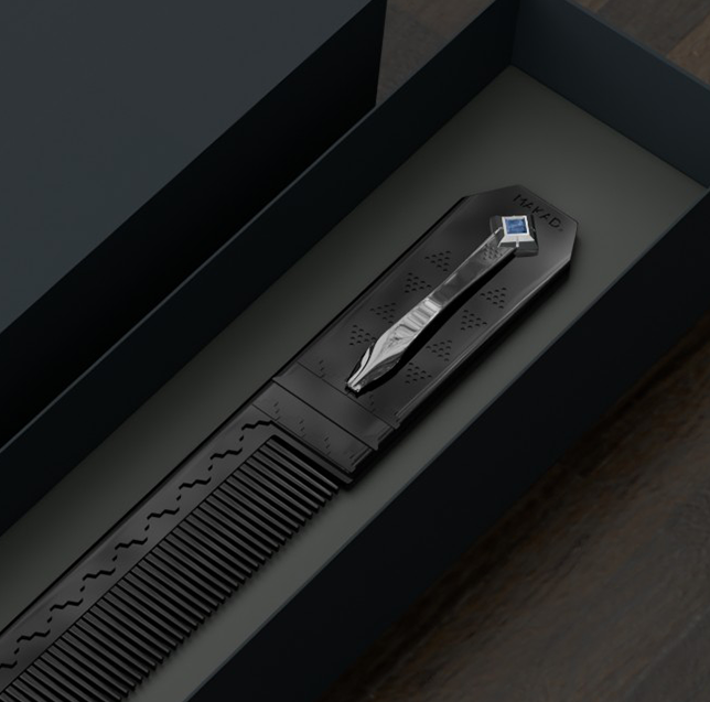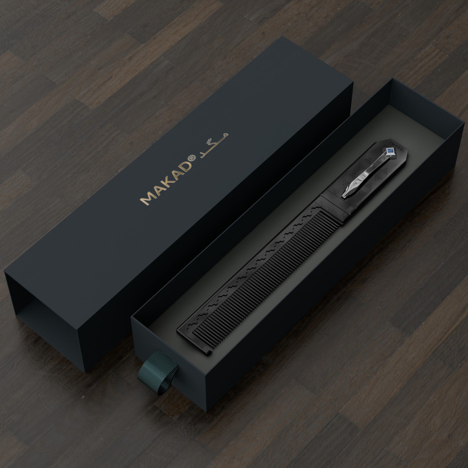 The powerful Senstitile comb, rust and mold resistant, elegant, and inlaid with artificial blue sapphire.